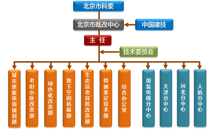 中心下設(shè)城市更新策劃規(guī)劃部、老舊小區(qū)改造部、綠色化改造部、地下空間拓展部、生態(tài)適老宜居改造部、檢測(cè)鑒定技術(shù)部和綜合辦公室。為加強(qiáng)協(xié)調(diào)創(chuàng)新,中心整合京津冀行業(yè)優(yōu)勢(shì)資源,與北京筑福研究院、天津大學(xué)、中土大地公司、北京廣源興業(yè)科技發(fā)展有限公司聯(lián)合成立了加裝電梯分中心、天津分中心、河北分中心、人防分中心。