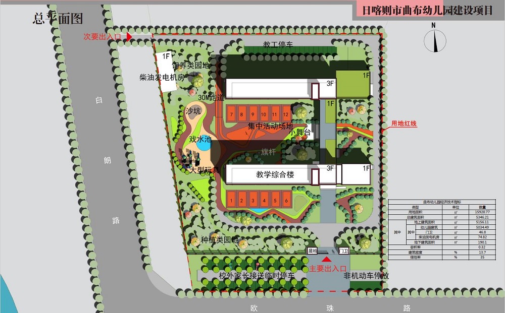 ????本項(xiàng)目位于日喀則珠峰開發(fā)開放試驗(yàn)區(qū)教育城內(nèi),規(guī)劃為12班幼兒園,建設(shè)用地為15920.77㎡,建筑總面積為5346.21㎡,其中地上建筑面積為5156.11㎡,地下建筑面積為190.1㎡。項(xiàng)目用地南側(cè)為規(guī)劃道路,西側(cè)為綠化用地和規(guī)劃道路,東側(cè)和北側(cè)分別為規(guī)劃桑珠孜區(qū)第四小學(xué)和規(guī)劃園丁苑。